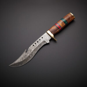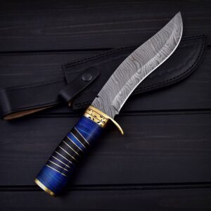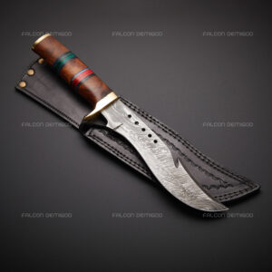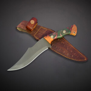 Damascus Hunting Bowie Knife Pakka Wood Handle With Leather Sheath.